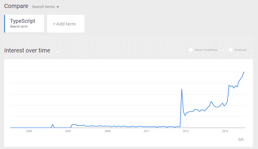 Looking at Google Trends, TypeScript has continued to gain traction in the last couple of years since release. Angular 2’s dependency on TypeScript will mean that traction will continue to grow - Angular is hugely popular.