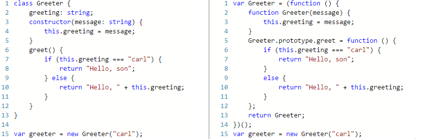 You can see that the TypeScript is much cleaner - no IFFE to mimic a class or “prototype” references when defining functions, …