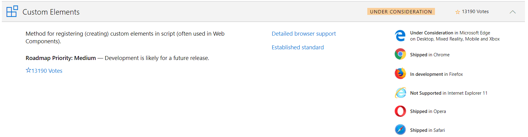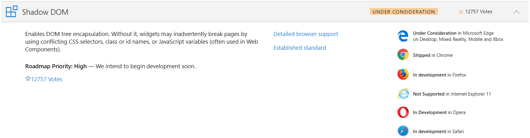 If we look at the shadow DOM on the Microsoft developer site, the message and number of votes are encouraging.