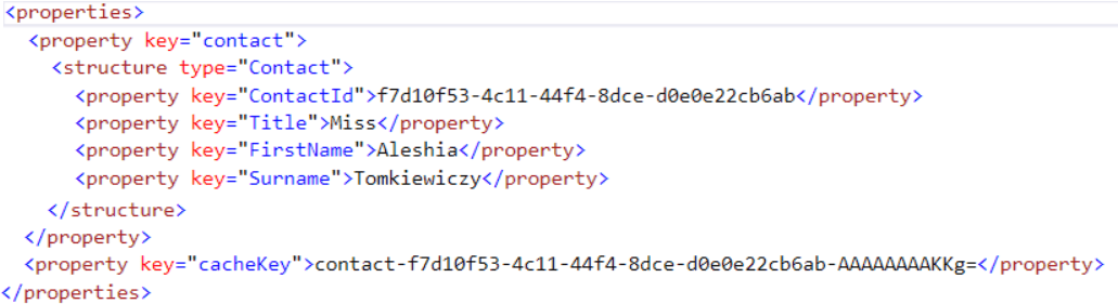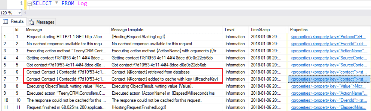 }The Properties column contains useful additional information, including what we specified in our structured log after the contact is added to the cache is: