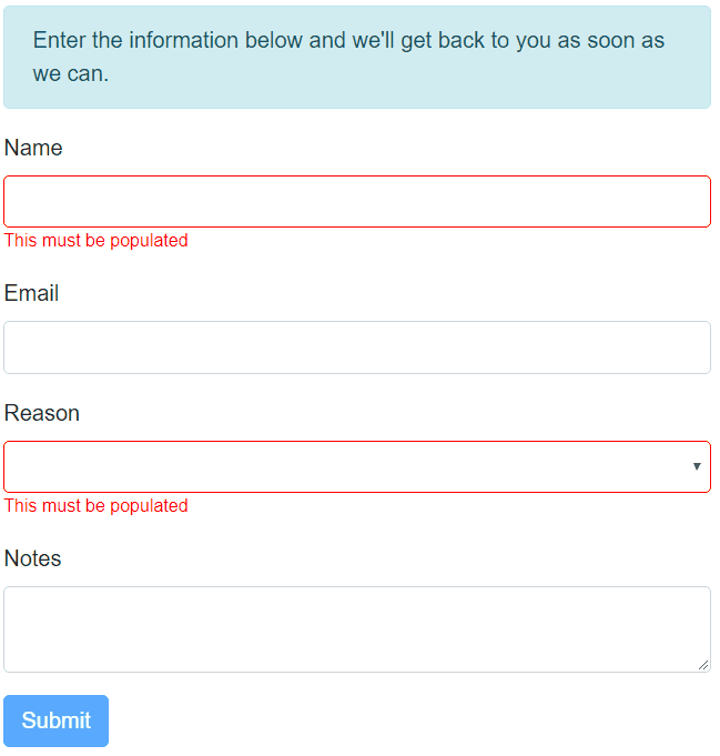 We want the person’s name and the reason for contact to be required fields. The person’s email should be a valid email. The notes should also be limited to 1000 characters.
