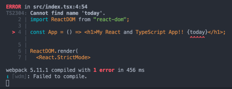 ...Of course, this is an error because we haven’t declared and initialized today anywhere. Webpack will raise this type error in the terminal: