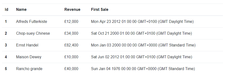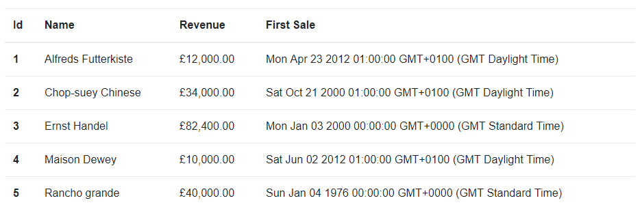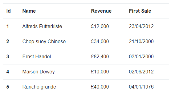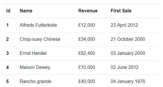 </td>In the above example we are formatting to revenue using Great British locale, using the Great British currency style.