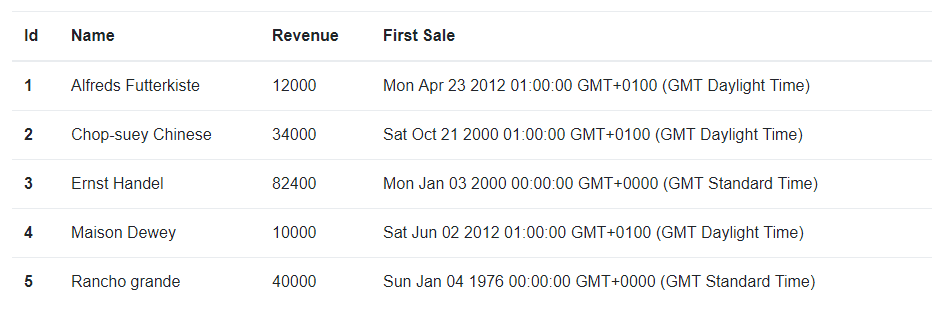 <td>{customer.firstSale.toLocaleDateString()}</td>… which gives us a nice short date: