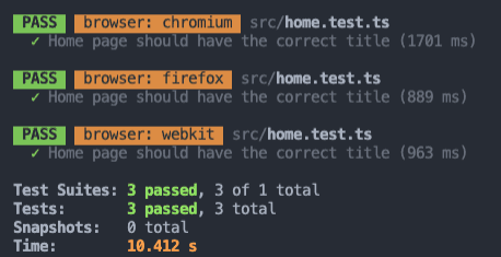 testEnvironmentOptions: { "jest-playwright": { browsers: ["chromium", "firefox", "webkit"] }, }};We’ve specified that our tests should be run on Chromium, Firefox, and Webkit.