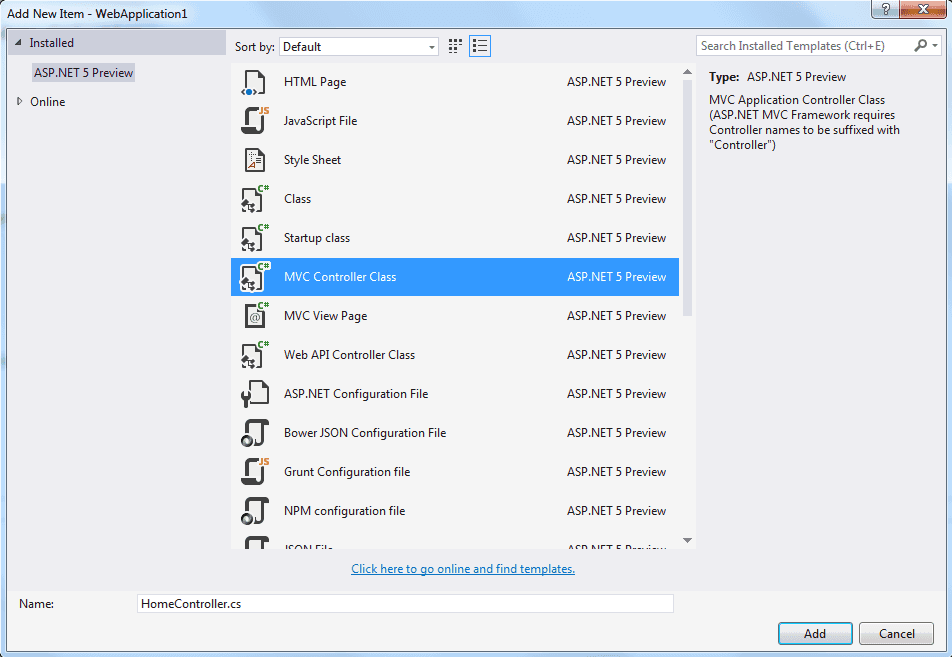 Add a new folder called “Controllers” and add a new MVC controller into it called “HomeController”.