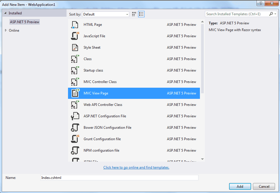 Add a new folder called “View” and a sub folder called “index” and add a new MVC view into it called “Index”.