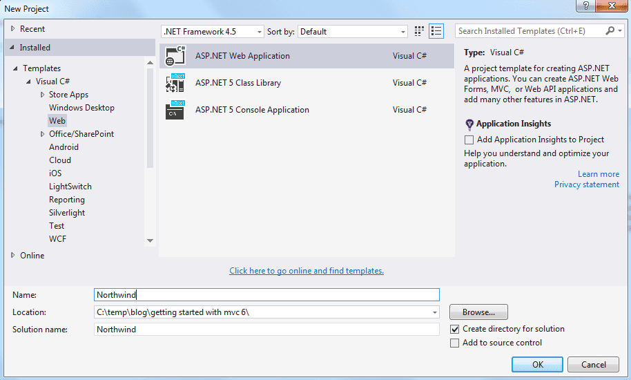 When you create a new project, select ASP.NET Web Application from the list of templates. Don’t worry about the framework version on this dialog.