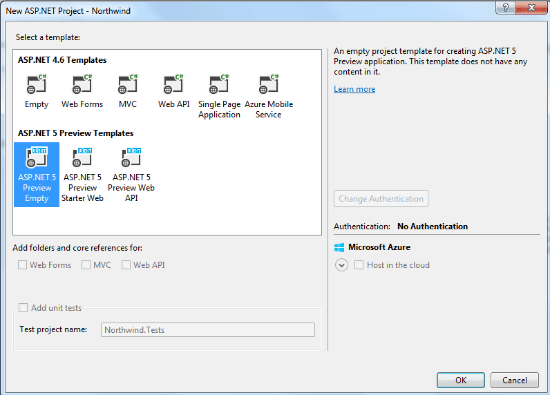 In this example we are then going to select ASP.NET 5 Preview Empty from the list of ASP.NET templates.
