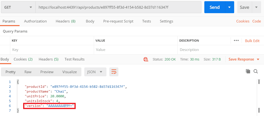 If we include the value from this rowversion field in the GET request for a product and require it in the PUT request, we can check if the product has changed before making the database update.