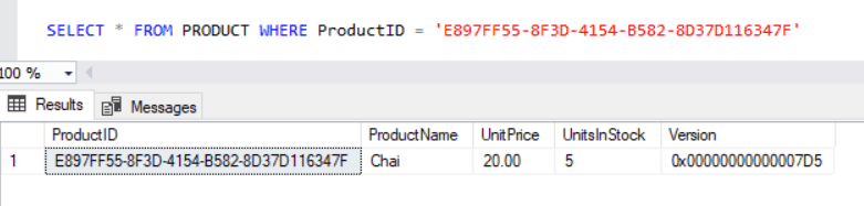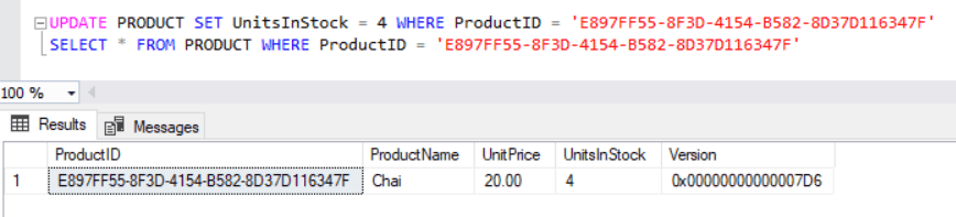If we update and select the product again, we see that SQL Server has updated the Version: