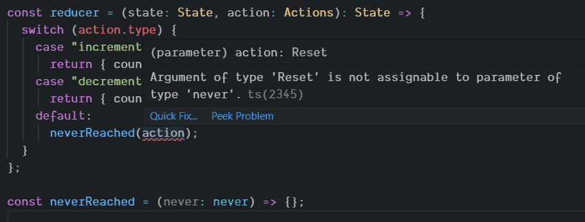 type Actions = Increment | Decrement | Reset;The TypeScript compiler errors as we hoped. Neat!