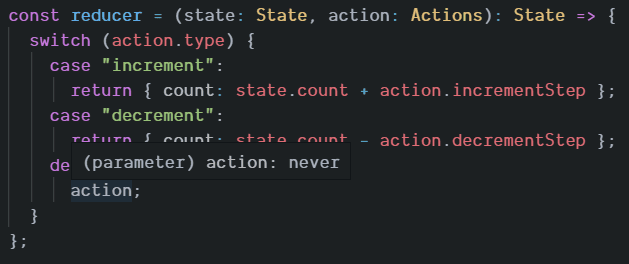 The following code is a simple reducer for a counter component. It contains a switch statement over a union type which is pretty type safe:
