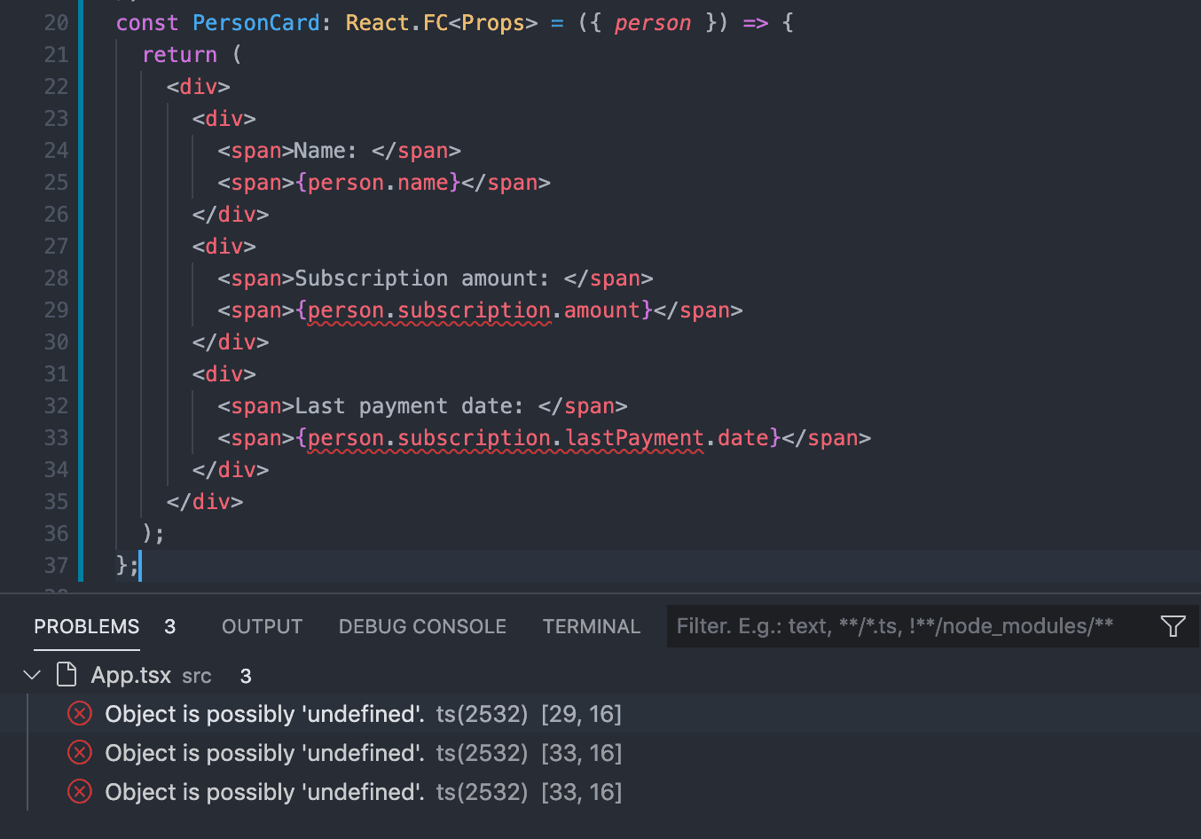 };The highlighted lines raise type errors, Object is possibly ‘undefined’, because the subscription property is optional and, therefore, could be undefined. The same goes for the lastPayment property inside the subscription object: