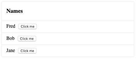 />Above is an example of consuming the List component. We render the list header using a h3 using the renderHeader prop. We render each data item in a span with a “Click me” button alongside it using the renderItem prop. Below is the result: