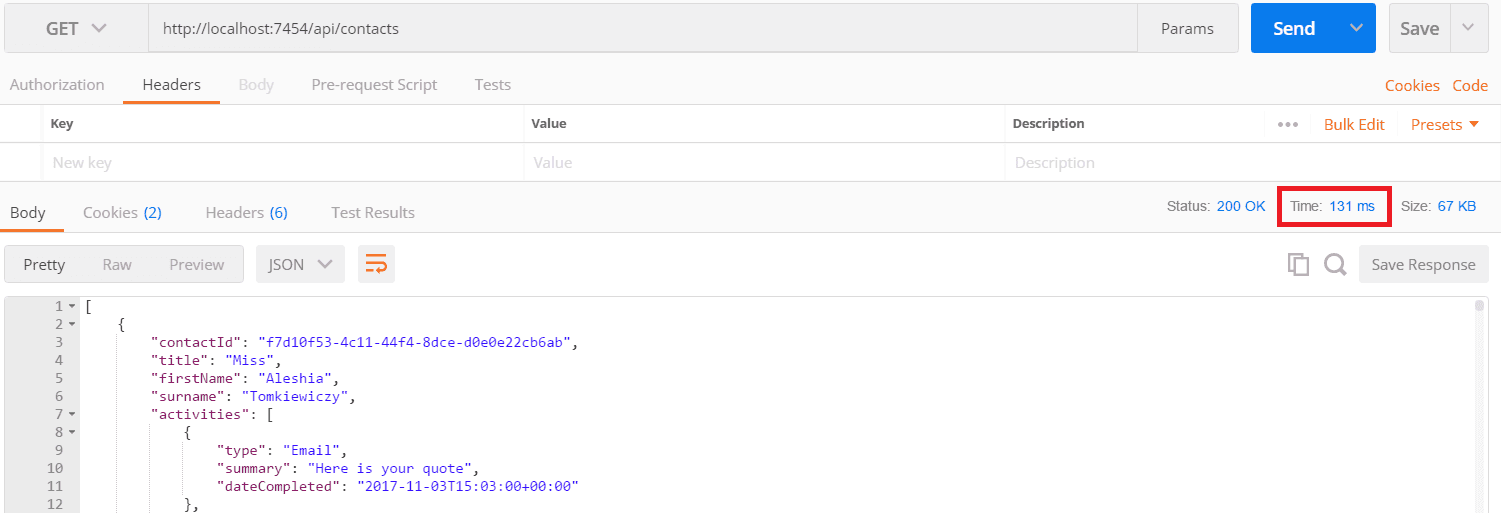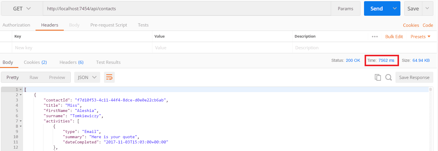 }We can see in Postman that the endpoint responded much quicker: