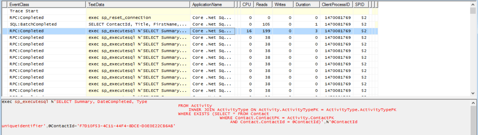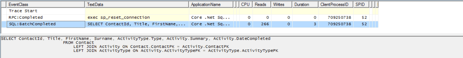 If we use SQL profiler, we can see there is a call to get the Contact record and then “N” calls to get the Activity records for each contact - the classic “N+1” problem!
