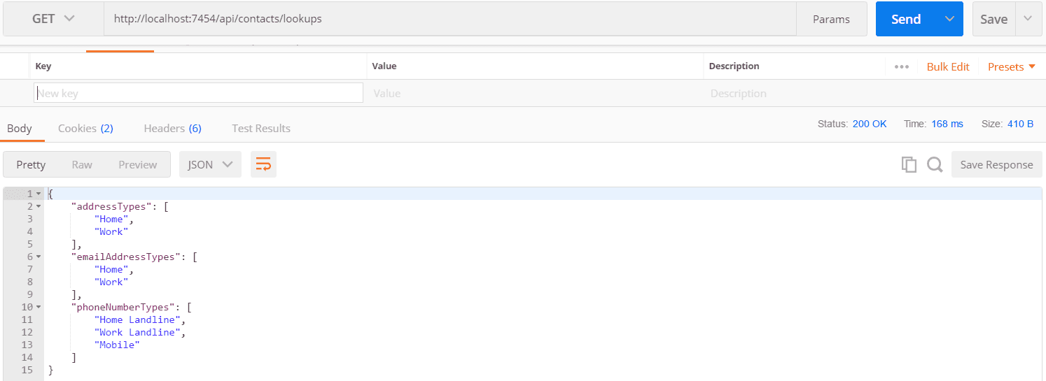 As an example, let’s look at the implementing a single controller action for some contact “lookup” values that are needed for a screen in an app that is used by our API. Here are the database tables: