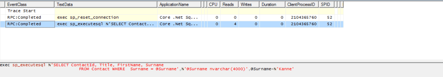 }Looking at the profiled SQL for GET api/contacts?surname=Kanne, we see that it is nice and efficient: