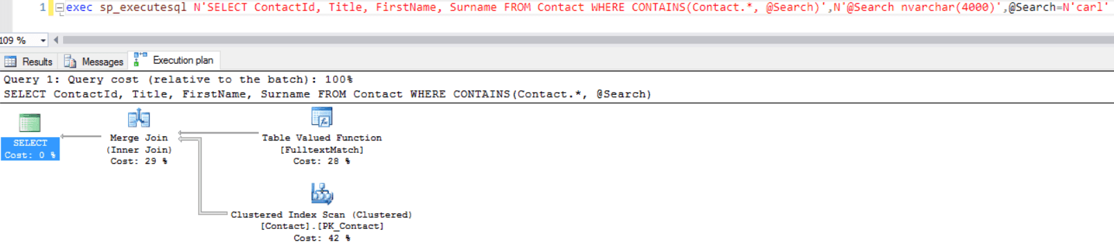 Looking at the SQL execution plan, we see that it is using our Full-Text index, which is great: