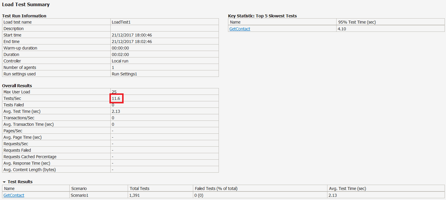 After the load test has finished running, we get a summary of the results. The statistic that I’m most interested in is “Tests / Sec” which is similar to “Requests / Sec” in WebSurge.