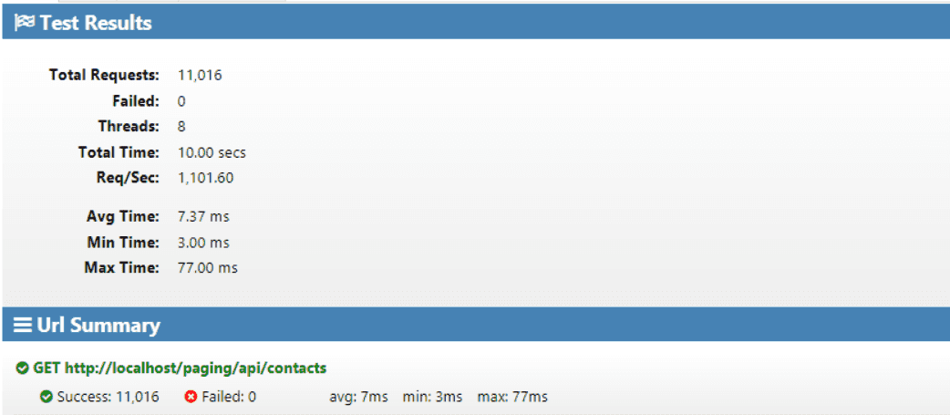 If we load test this on the 1st page of data, we see an improved requests per second: