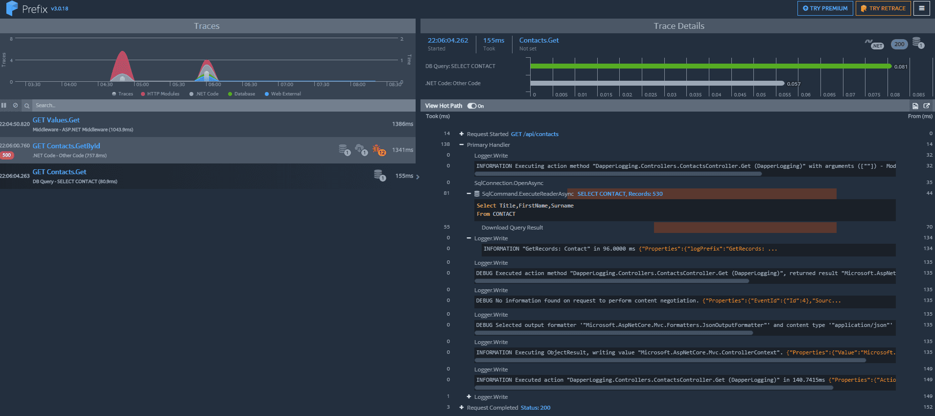 If we then run our ASP.NET Core Web API in Visual Studio, Prefix will start to profile our API. We will see the requests, database queries and other information we’ve written to Serilog: