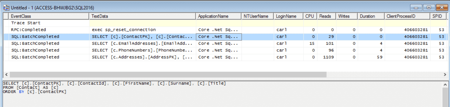 As the name suggests, SQL Server Profiler traces the SQL statements executed on a SQL Server database. This is a tool that comes with SQL Server and obviously is only useful if our API uses SQL Server for its storage! If we are using a different database then there is likely to be an equivalent profiler.