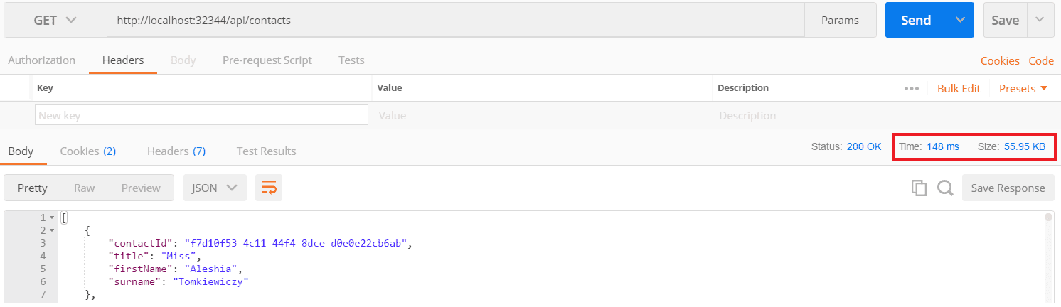 Below is the popular Postman tool, giving us the duration and size of the response.