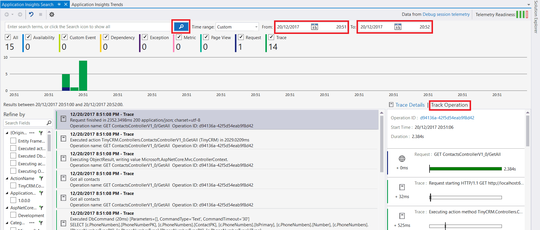After we’ve added Application Insights to our solution in Visual Studio, we can view the trace information by going to “View > Other Windows > Application Insights Search”. If we enter a date and time in the “From” and “To” inputs and click the search icon, we will hopefully see trace information for the API calls in the bottom half of the screen. The actual individual trace items are in the middle column. If we click on a trace item, we get additional details of the item to the right of it. The element that I find really useful in the “Track Operation” section on the bottom right of the screen. This gives us an overview of the API call and we can quickly see what bits are slow and need further investigation.