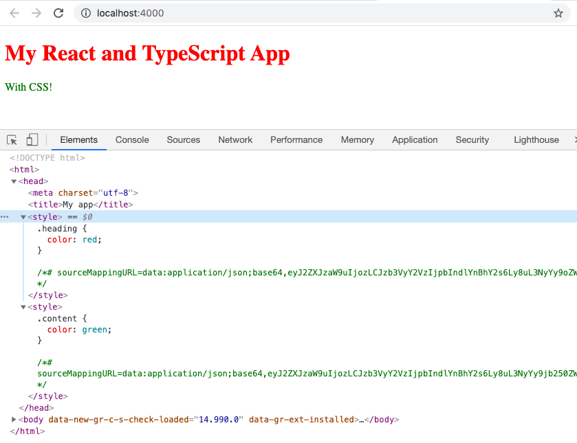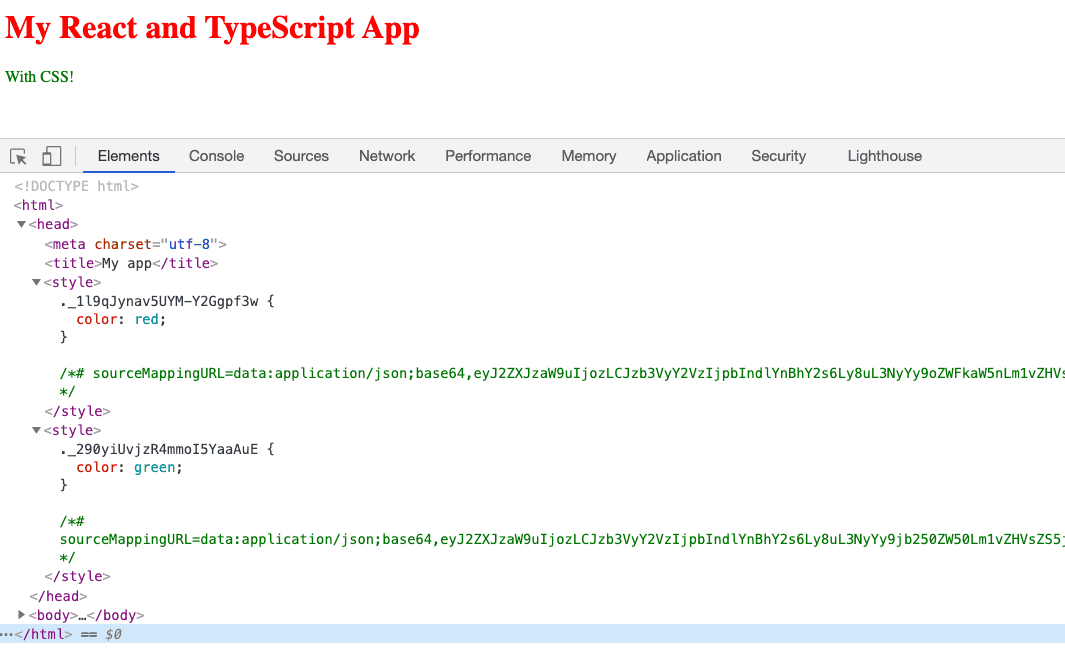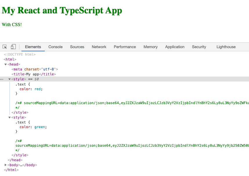 }If we run the app in dev mode (npm start), we will see the components are styled as we expect by two style elements on the HTML page: