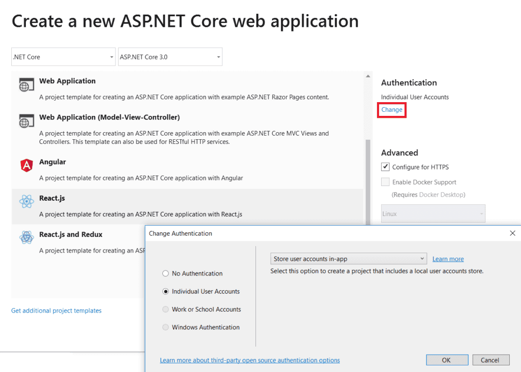 When using the SPA template to create a new project, the option to include authentication is now available: